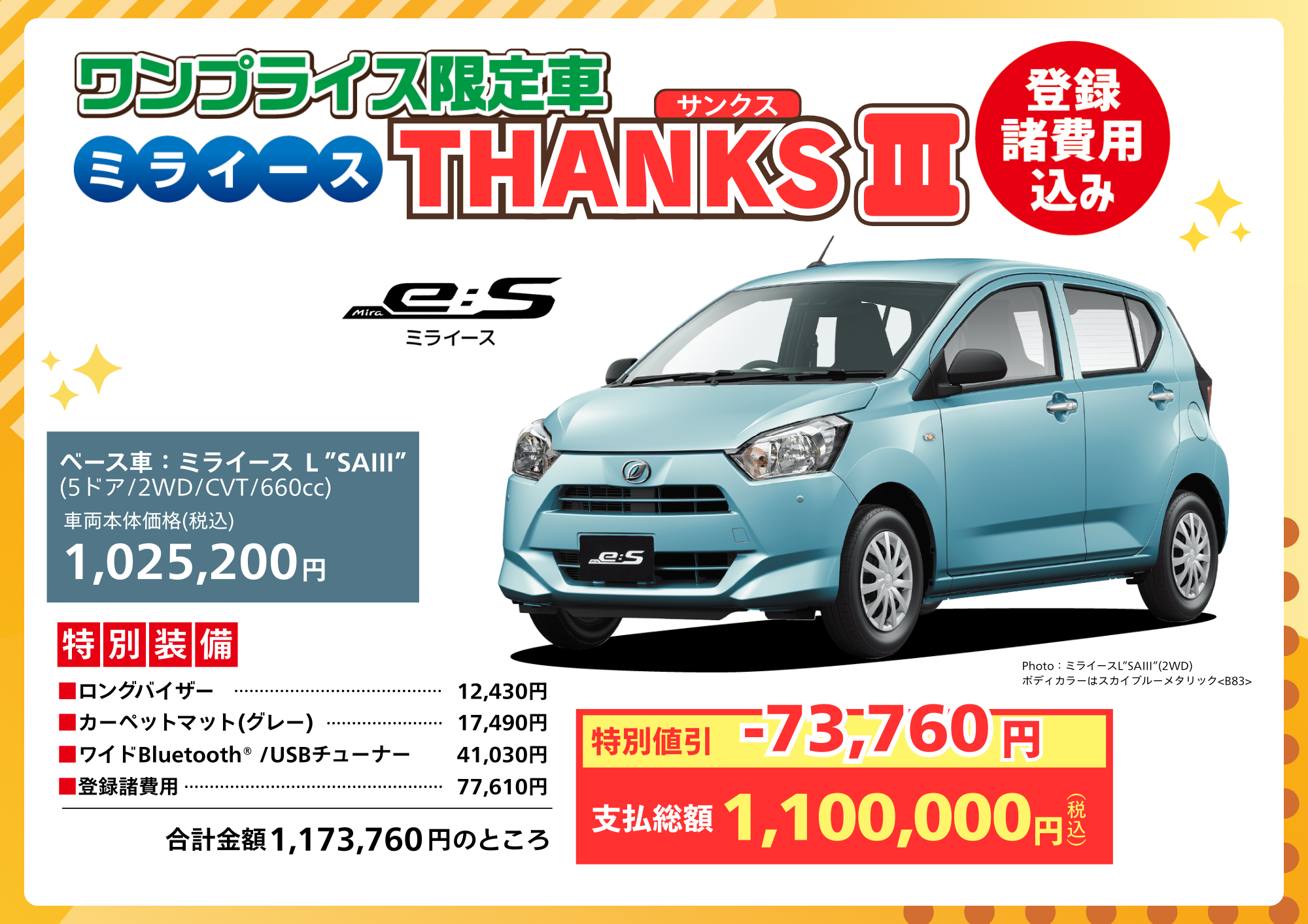 ※ワンプライス限定車ミライースTHANKSⅢはミライースL”SAⅢ”のグレードがベースとなります。支払い総額には車両本体価格のほか、税金・自賠責保険料、登録等に伴う費用、リサイクル料金、車庫証明が含まれています。納車費用、下取車に関する費用は含まれておりません。限定車の価格は2026年3月末日登録までの価格です。●高知県内登録に限ります。●記載の付属品以外のメーカーオプション・ディーラーオプションは別途申し受けます。本限定車は予告なく終了する場合がございます。予めご了承ください