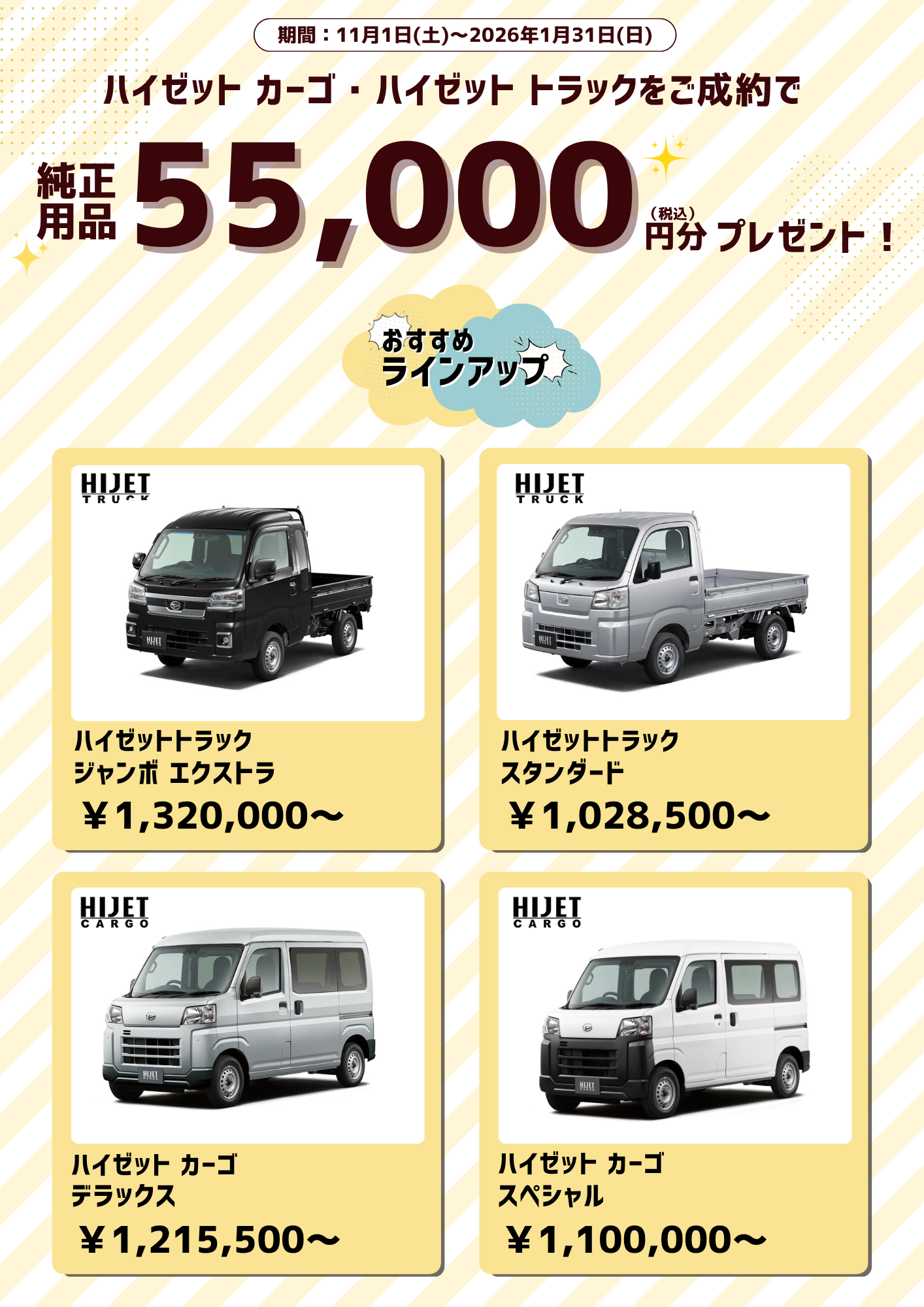 - ●キャンペーンは特装車・福祉車両・限定車等一部対象外のお車がございます。