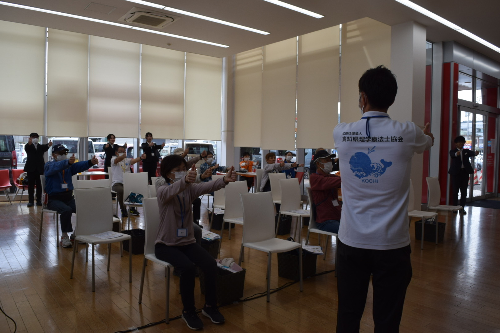 今回の講座には73歳~最年長は85歳の19名にご参加いただき、高知県理学療法士協会様、JAF高知支部様、高知市健康福祉部 基幹型地域包括支援センター様のご協力のもと、認知機能維持のための運動指導、安全運転のための正しい姿勢、死角の確認など様々な講習を行いました。