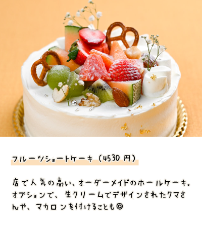 旬の果物を贅沢に使用し、オーダーメイドで仕上げるホールケーキは、見た目も味も特別で、記念日やお祝いごとにもぴったり。