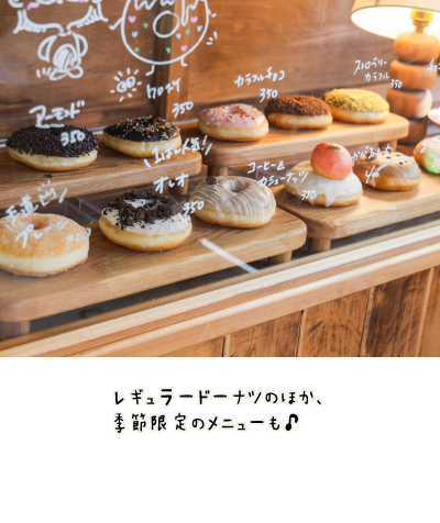 ザクザクの砂糖をたっぷりまぶした「プレーン」をはじめ、季節限定の可愛いオリジナルドーナツは、眺めても食べても思わずにっこり笑顔に♪