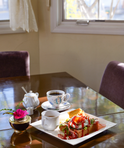 扉を開けた瞬間、旅をしているかのような気分に誘われるカフェ「エミュ」。 ヨーロッパテイストのインテリアに囲まれた空間は、非日常感を感じながらも、自然と肩の力が抜ける心地よさ。 こちらでは、店主がパリで出合った朝ごはんをヒントにしたモーニングプレートがいただける。 カリふわでもっちりとした食感のグルテンフリーのパンに新鮮な地元野菜を添えた、ボリューム感も嬉しい一皿。 日常を少し忘れて、ゆったりとしたひとときを過ごしてみて。